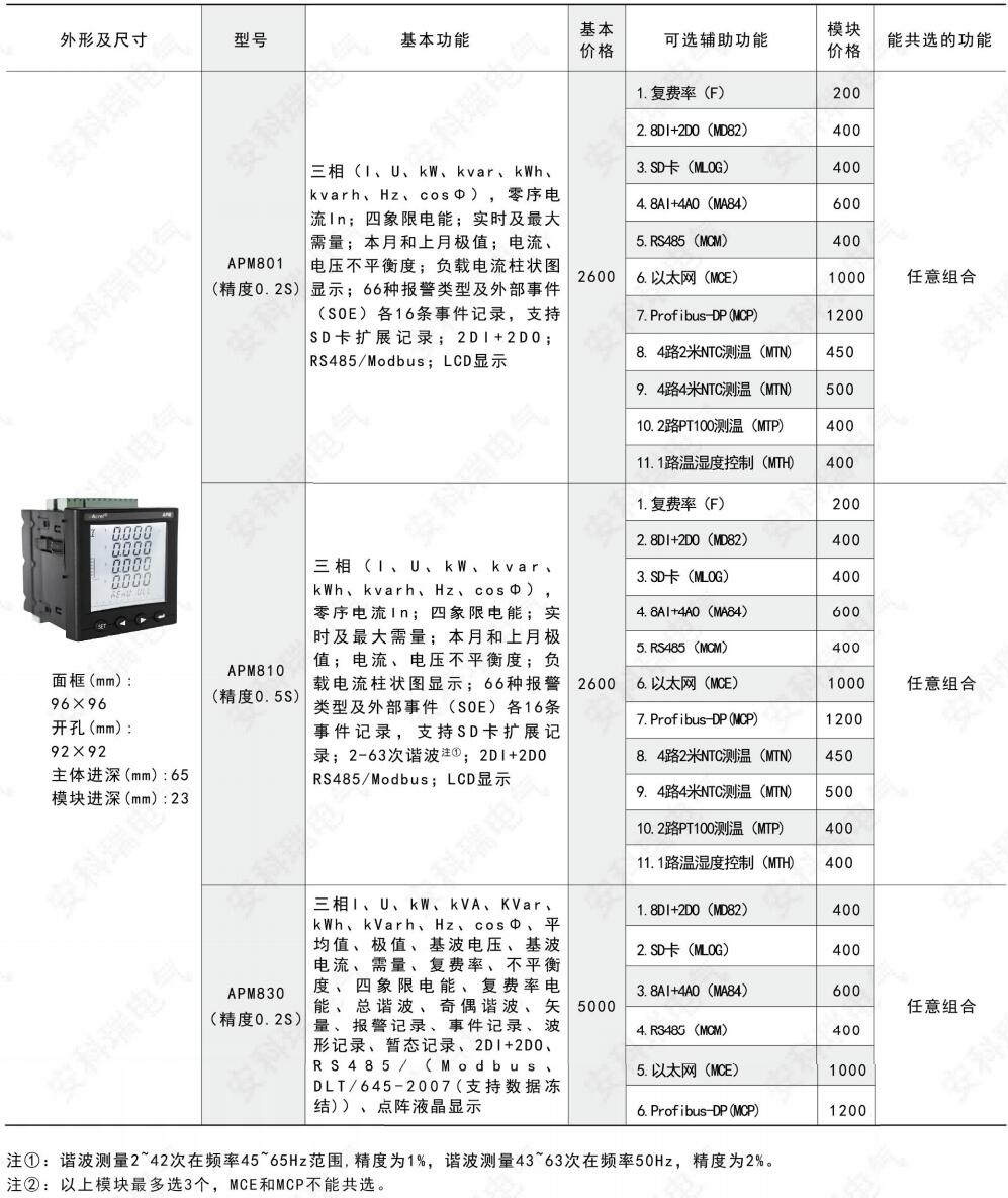 APM系列網絡電力儀表按IEC標準設計,具有全電量測量,電能統計,電能質量分析及網絡通訊等功能,主要用于對電網供電質量的綜合監控診斷及電能管理。該系列儀表采用了模塊化設計,當客戶需要增加開關量輸入輸出,模擬量輸入輸出,SD卡記錄,以太網通訊時,只需在背部插入對應模塊即可。