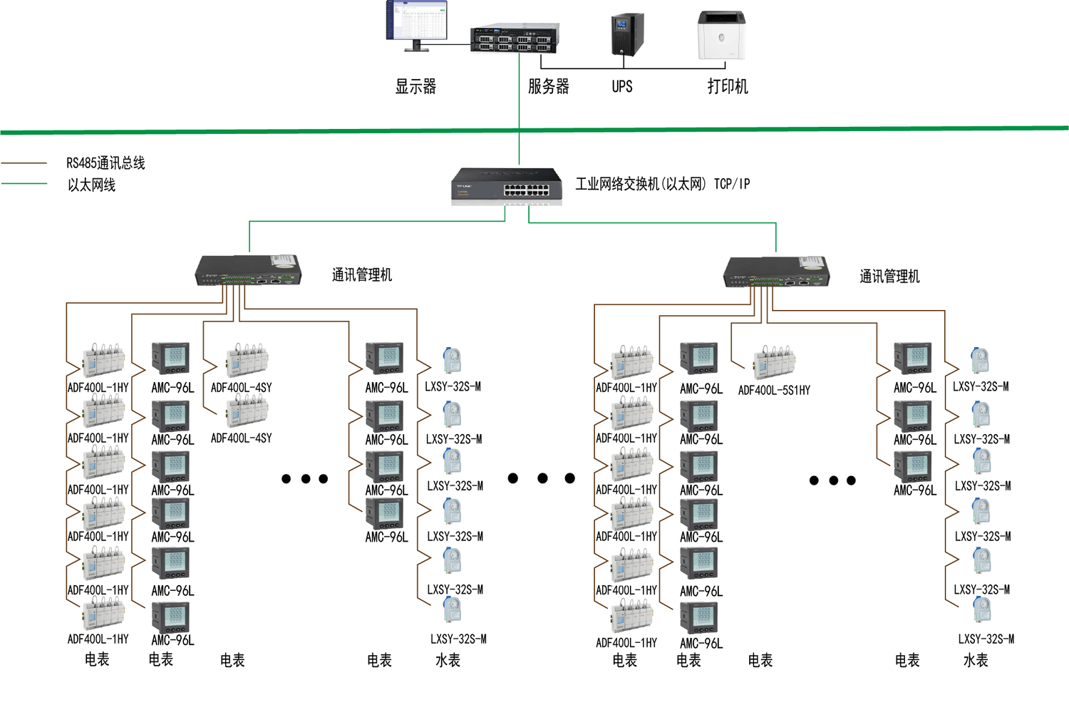 該項目現(xiàn)場設(shè)備層儀器儀表共計ADF400L各系列電表共計56塊,AMC96L電表56塊,水表93塊。四個采集箱安裝在負(fù)一層,所有電表水表通訊線在負(fù)一層連接到采集箱。