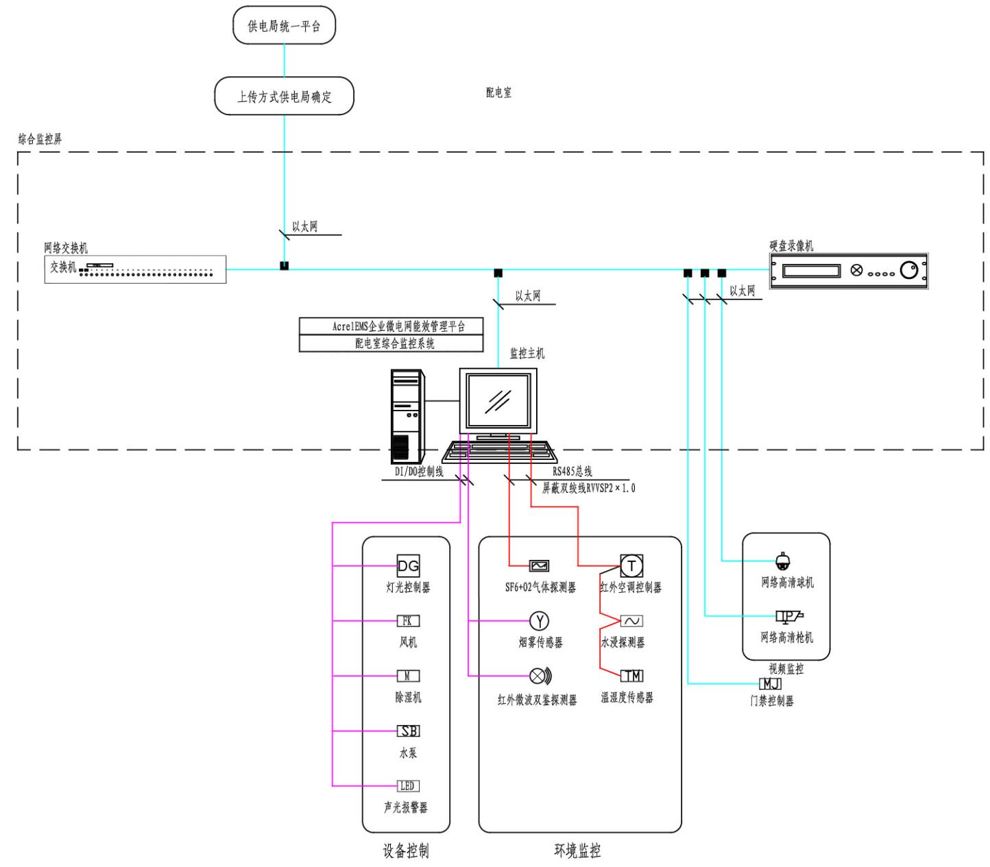 配電室綜合監(jiān)控系統(tǒng)包括智能監(jiān)控系統(tǒng)屏、通訊管理機(jī)、UPS電源、視頻監(jiān)控子系統(tǒng)(云臺球機(jī)、槍機(jī))、環(huán)境監(jiān)測子系統(tǒng)(溫度、濕度、水浸、煙感)、控制子系統(tǒng)(燈光、空調(diào)、除濕機(jī)、風(fēng)機(jī)、水泵)、門禁監(jiān)控子系統(tǒng)(讀卡器、開門按鈕、磁力鎖)、安防監(jiān)控子系統(tǒng)(雙鑒檢測器)。