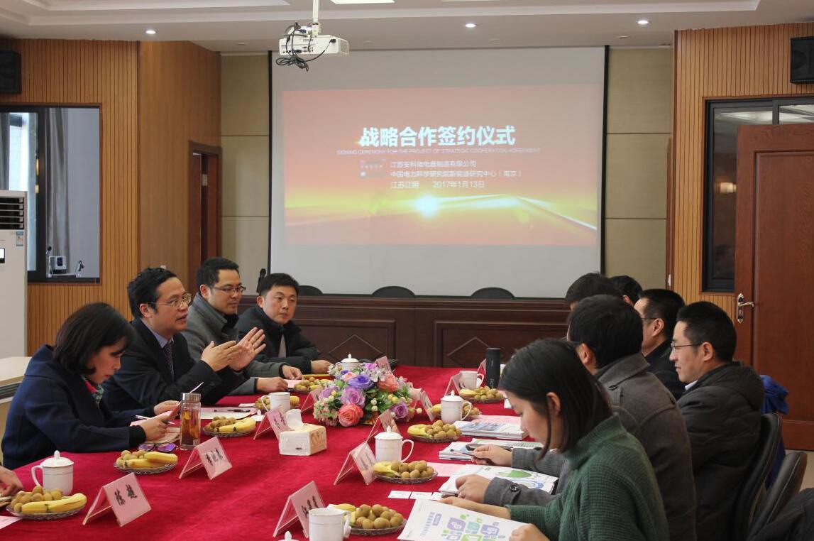 2017年1月13日下午,江蘇安科瑞電器制造有限公司和中國電科院新能源研究中心合作項目的簽約儀式,在江蘇安科瑞電器制造有限公司隆重舉行。參加此次簽約雙方代表有:安科瑞董事長/總經理周中、副總經理朱芳、副總經理宗壽松、副總經理楊廣亮;中國電科院新能源研究中心副主任丁杰、南京分院綜合管理中心主任吳福保、新能源研究中心儲能應用室主任楊波。此次簽約標志著雙方就微電網集成、儲能變流器(PCS)及系統集成、同步電動機啟動變頻器、移動式電池儲能應急發電車等產品的技術研發、生產、銷售、服務等多方面的合作達成一致,建立了穩固的合作伙伴關系。