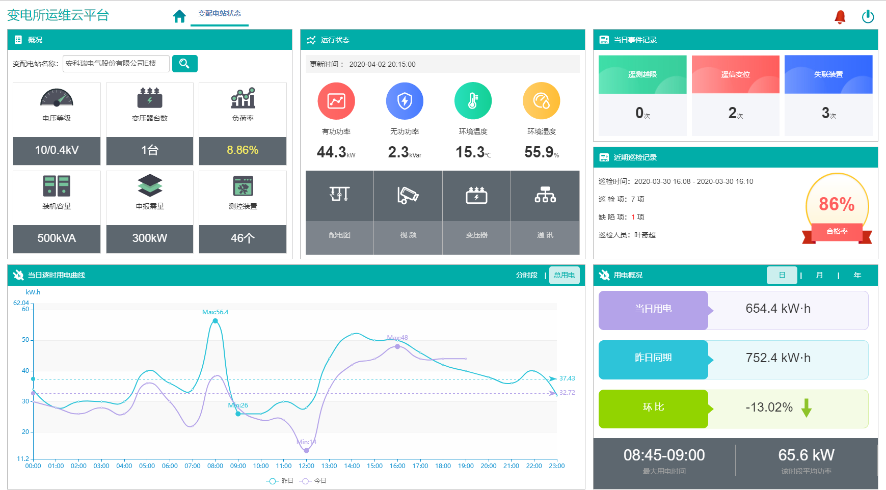支持大屏展示用戶運(yùn)維變電所概況、環(huán)境監(jiān)測(cè)、實(shí)時(shí)電壓、實(shí)時(shí)負(fù)荷、實(shí)時(shí)電量、配電圖等。