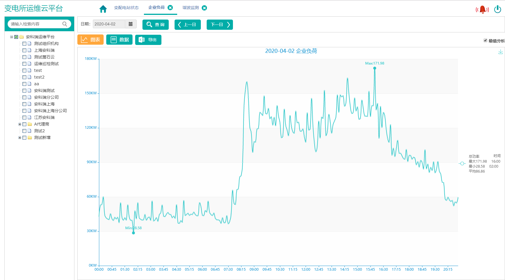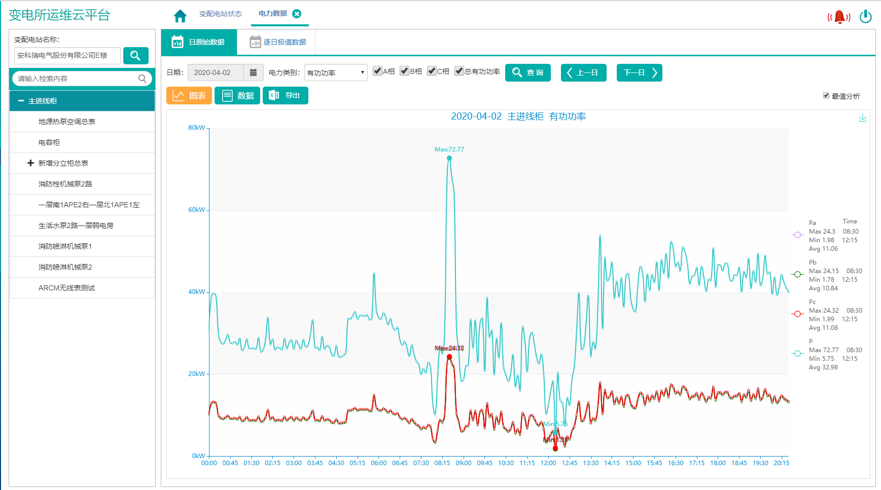 電力數(shù)據(jù)顯示選定變電所選定回路的電力數(shù)據(jù)和曲線,包括電流、相電壓、線電壓、頻率、功率因數(shù)、有功功率、無(wú)功功率、視在功率、電壓、電流不平衡度等參數(shù),曲線顯示統(tǒng)計(jì)期內(nèi)大、小、平均值,并支持導(dǎo)出圖表;方便用戶通過(guò)表格查詢數(shù)據(jù)