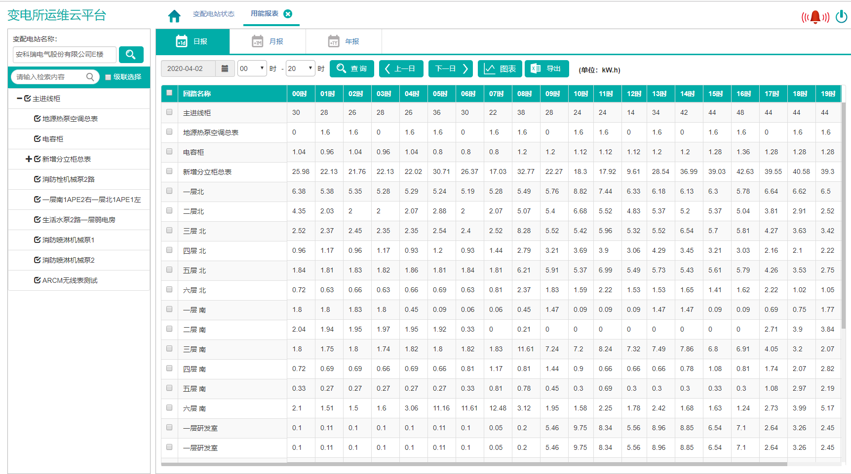 用能報(bào)表顯示各回路的用能數(shù)據(jù),包括日?qǐng)?bào)、月報(bào)、年報(bào),日?qǐng)?bào)顯示分時(shí)用能,月報(bào)顯示分日用能,年報(bào)顯示分月用能,報(bào)表可以導(dǎo)出。