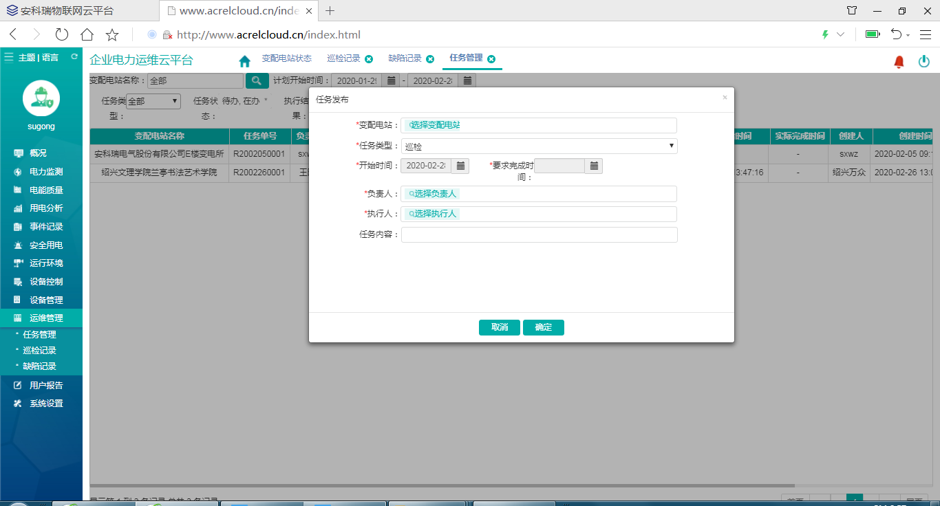 運(yùn)維管理包括任務(wù)管理、巡檢記錄、缺陷記錄三部分,其中任務(wù)管理可以完成任務(wù)的創(chuàng)建、發(fā)布、任務(wù)完成情況查詢;巡檢記錄是巡檢任務(wù)的執(zhí)行情況和執(zhí)行明細(xì),缺陷記錄是消缺任務(wù)創(chuàng)建、發(fā)布、完成狀態(tài)情況查詢。