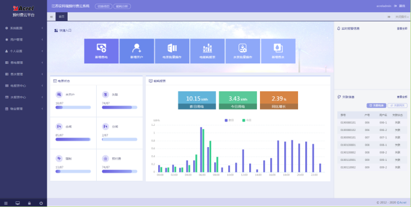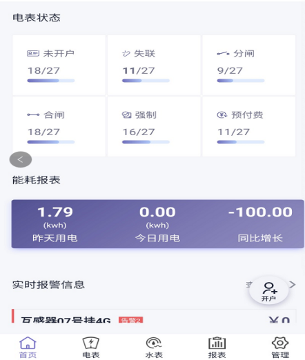 提供快捷的操作入口,包括:售電管理;新表開戶;電表批量操作;能耗統(tǒng)計報表;水表批量操作;售水管理等。