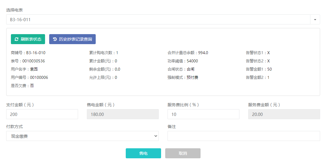 可以對已開戶的電表進(jìn)行遠(yuǎn)程售電,電費實時下發(fā)到電表,電表會根據(jù)電度走字實時扣除電費。售電可以設(shè)置服務(wù)費比例,實際充值到表中的金額將按比例扣除服務(wù)費之后再下發(fā),作為物業(yè)增加收取服務(wù)費的渠道。
