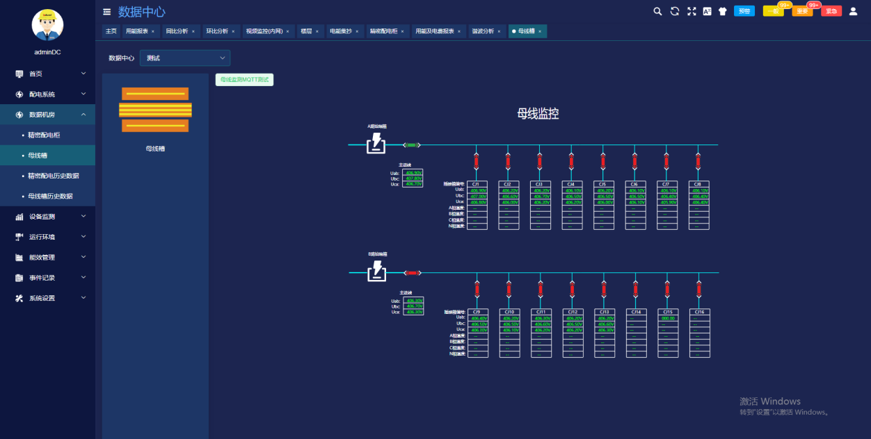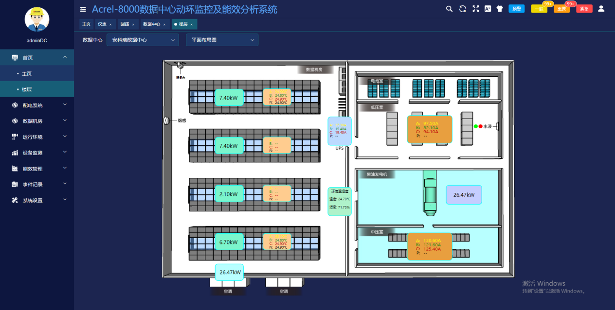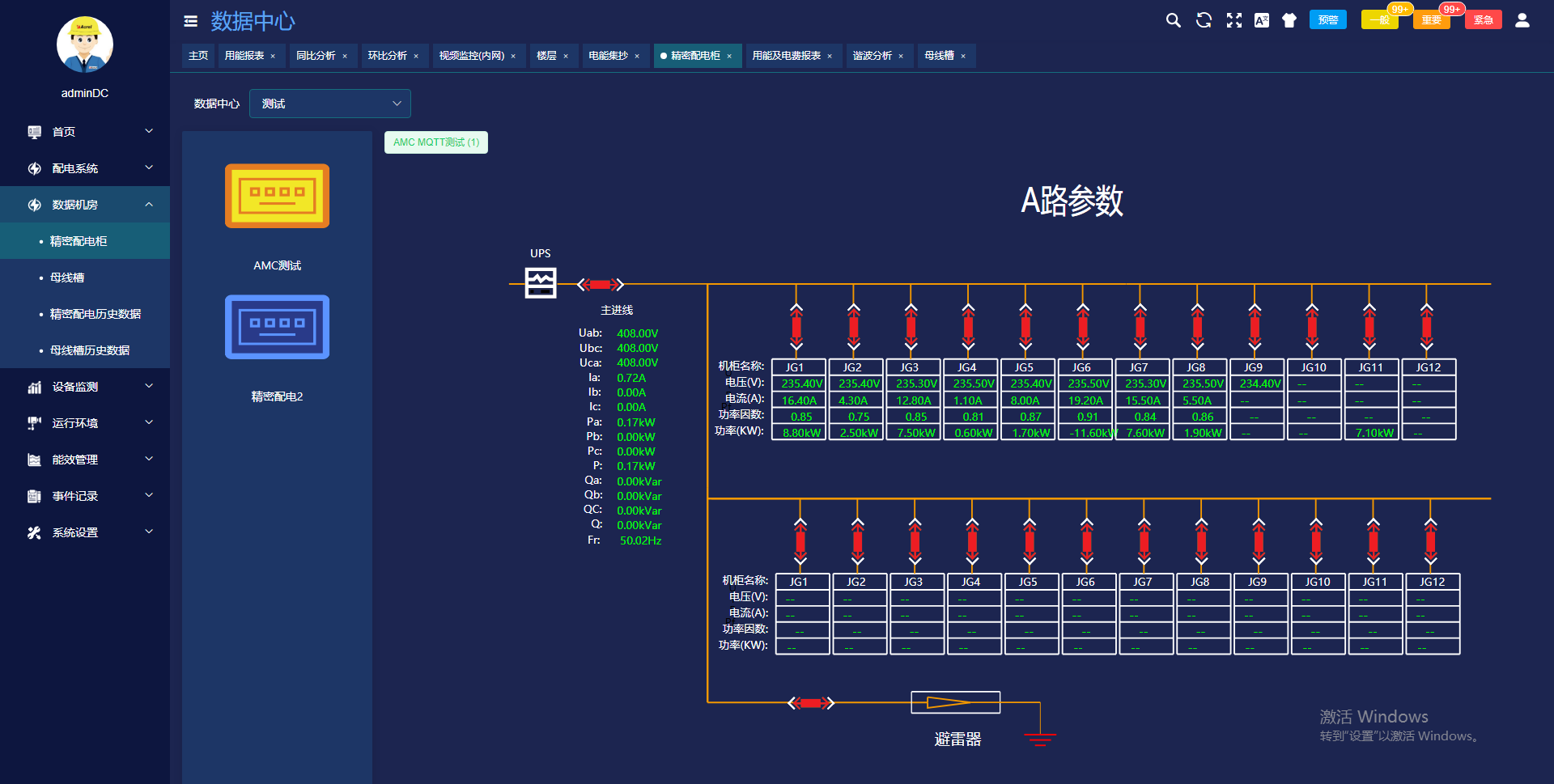 精密配電柜,通過SVG圖,將所有機(jī)柜的電壓,電流,功率,功率因數(shù)等參數(shù)顯示在圖中。