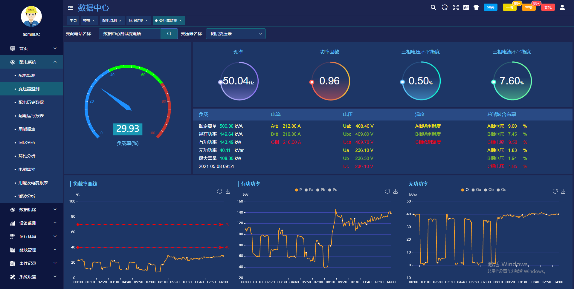 變壓器監(jiān)測監(jiān)測頁面實(shí)時(shí)監(jiān)測各變壓器各項(xiàng)參數(shù),包括福賊率。頻率,功率因數(shù),三相不平衡度等,并且顯示歷時(shí)曲線圖,數(shù)據(jù)實(shí)時(shí)變化。幫助用戶直觀監(jiān)測各變壓器運(yùn)行狀態(tài)。