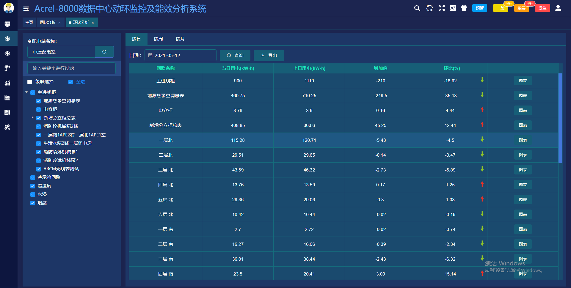 顯示各個(gè)用電回路。每日、每周、每月的環(huán)比用能情況。顯示增長或者下降比例。