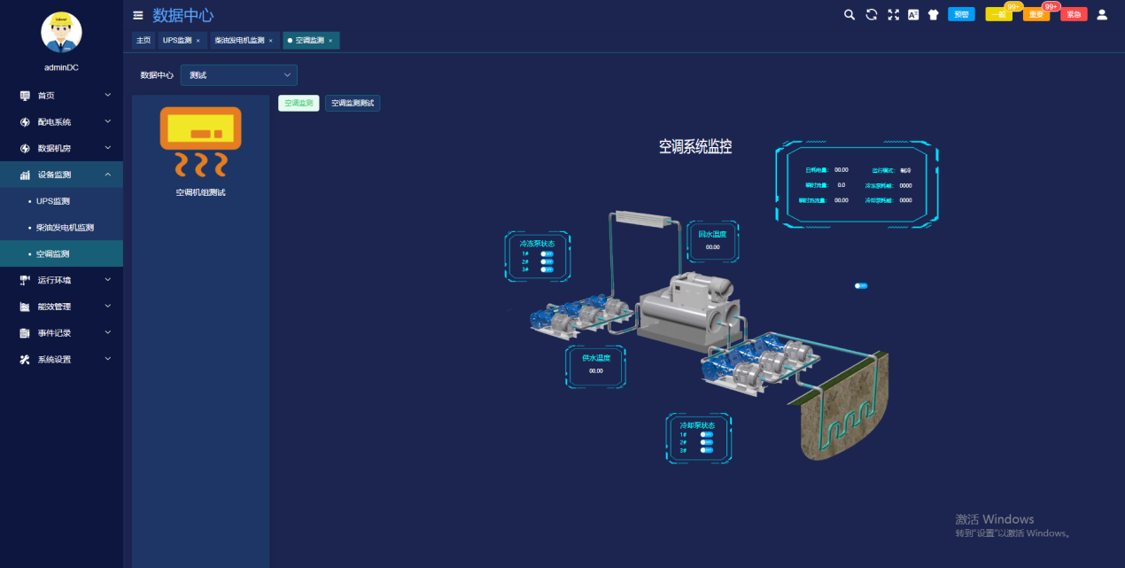 默認(rèn)打開系統(tǒng)的“主頁”界面。顯示該數(shù)據(jù)中心的實(shí)時(shí)PUE值,總能耗,IT能耗,空調(diào)能耗,動力能耗。