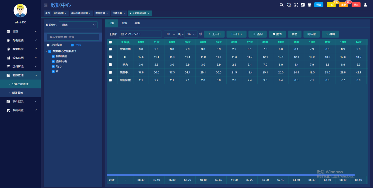 顯示當(dāng)前數(shù)據(jù)中心,IT、空調(diào)、照明動力用電各時(shí)段的用電情況。