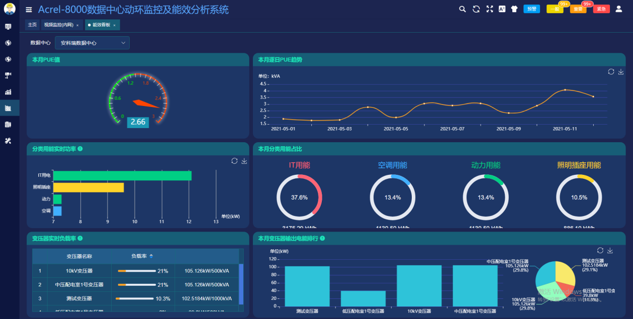 能效看板實(shí)時(shí)顯示當(dāng)前數(shù)據(jù)中心PUE值以及歷史PUE曲線。并且顯示各分項(xiàng)用能的用能情況及用能排行。監(jiān)測各變壓器運(yùn)行及負(fù)載情況,給出本月變壓器輸出電能排行。