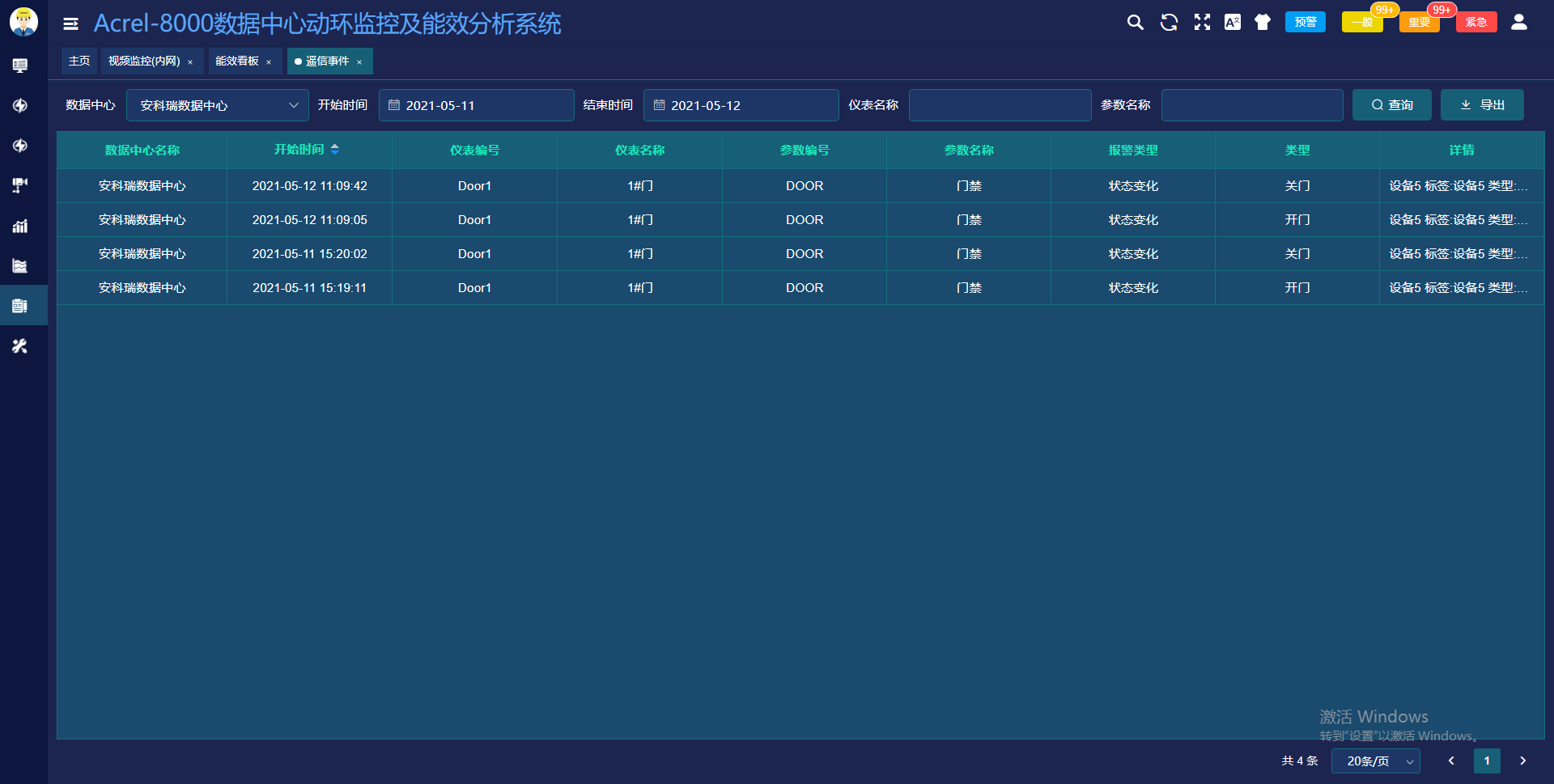 顯示當(dāng)前數(shù)據(jù)中心各遙測量、如門禁、煙霧、水浸等狀態(tài)變化的報(bào)警情況。