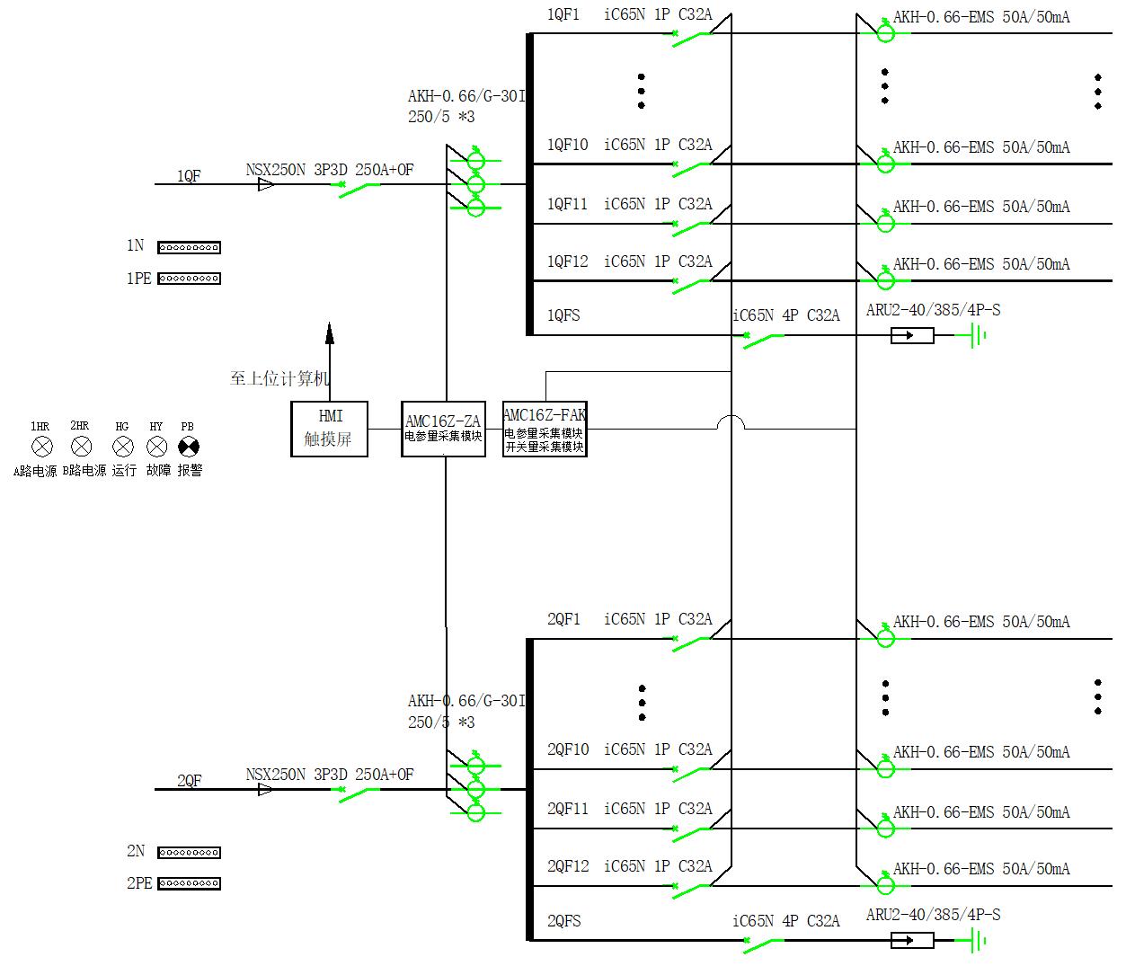 安科瑞交流精密配電監(jiān)控裝置系列是專門針對(duì)于數(shù)據(jù)中心服務(wù)器電源管理設(shè)計(jì)的測(cè)量裝置。該裝置設(shè)計(jì)小巧,能夠?qū)?A+B 兩路進(jìn)線和 96或192路出線的全電參量參數(shù)、輸入輸出開關(guān)及防雷器狀態(tài)等實(shí)時(shí)監(jiān)測(cè), 所有測(cè)量通道的告警閾值均可單獨(dú)設(shè)定,出線越限事件立即觸發(fā)系統(tǒng)聲光告警,在傳統(tǒng)儀表的體積上實(shí)現(xiàn)了監(jiān)控回路的高度集成。如典型配電圖。