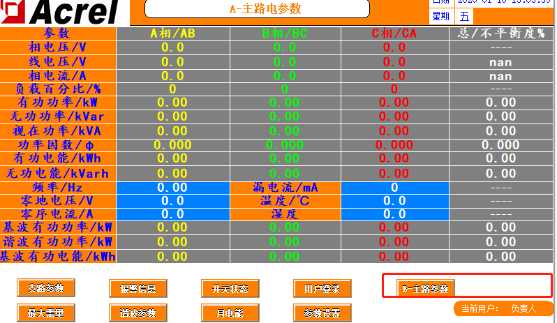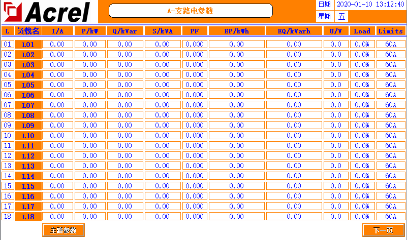 觸摸屏開啟后的第一個(gè)界面為主路參數(shù)界面,如果有多路進(jìn)線,可點(diǎn)擊右下角的按鈕切換查看其它進(jìn)線的參數(shù)。
