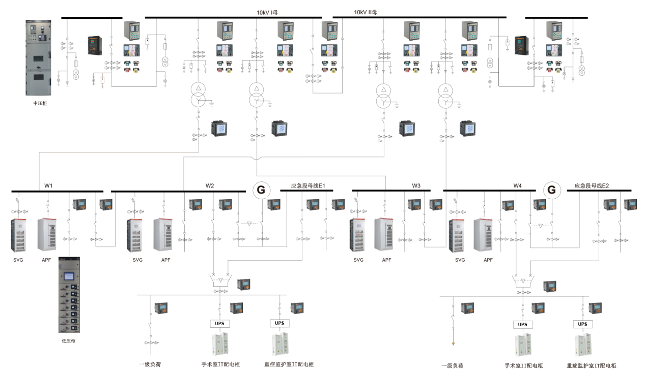 電力監控系統主要針對開閉所和10/0.4kV變電所,對高壓回路配置微機保護裝置及多功能儀表進行保護和監控,對0.4kV出線配置多功能計量儀表,用于測控出線回路電氣參數和用能情況。同時對醫院重要設備如柴油發電機、無功補償裝置、有源濾波裝置、UPS、隔離電源系統狀態進行監測。