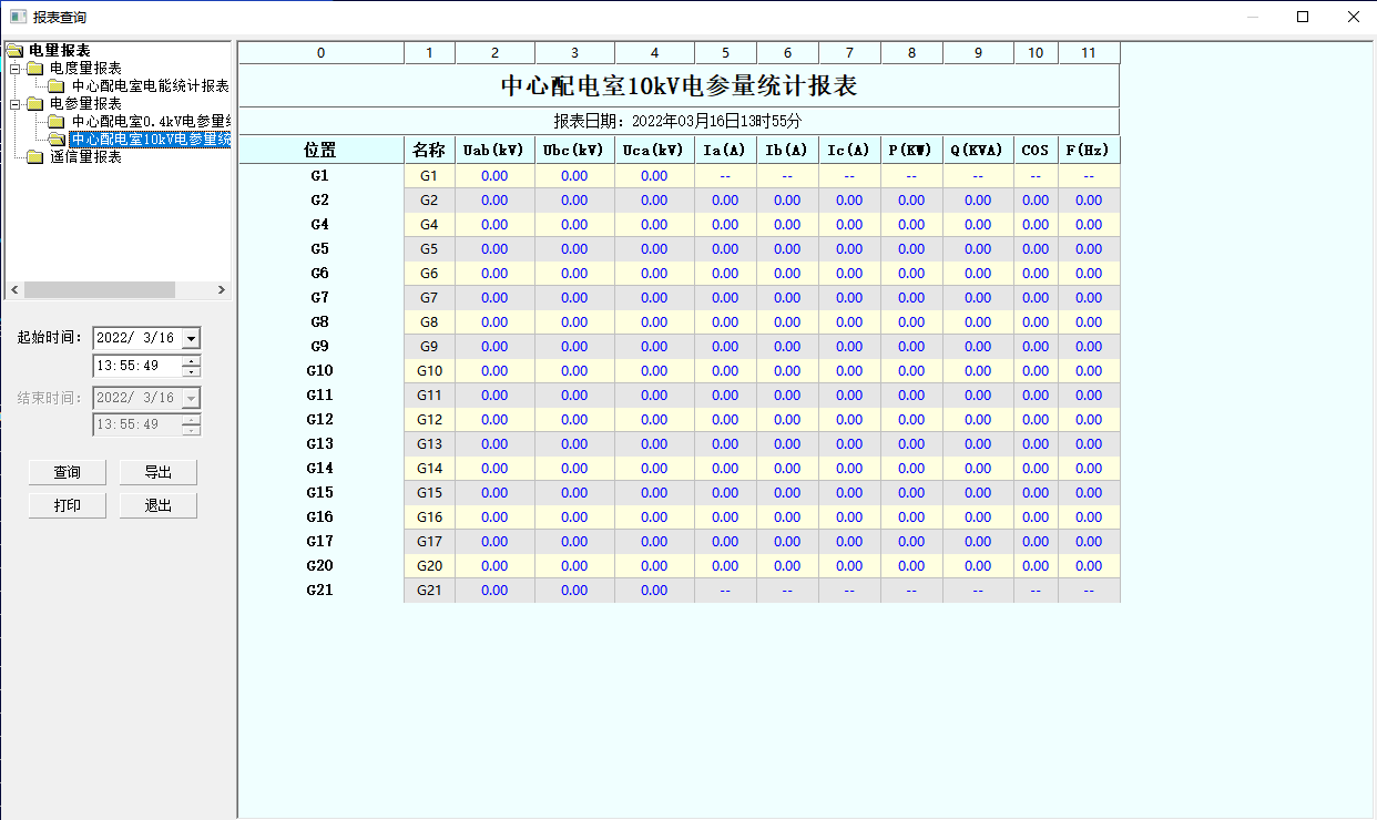 查詢各回路或設備指定時間的運行參數,報表中顯示電參量信息應包括:各相電流、三相電壓、總功率因數、總有功功率、總無功功率、正向有功電能等.