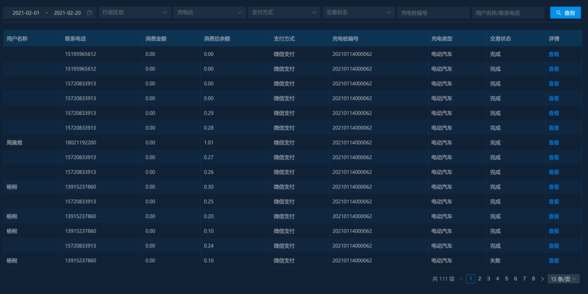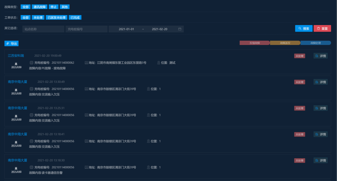 實時監控頁面可以在地圖上顯示每個站點的地圖定位,以及各站點中的充電樁實時數據。